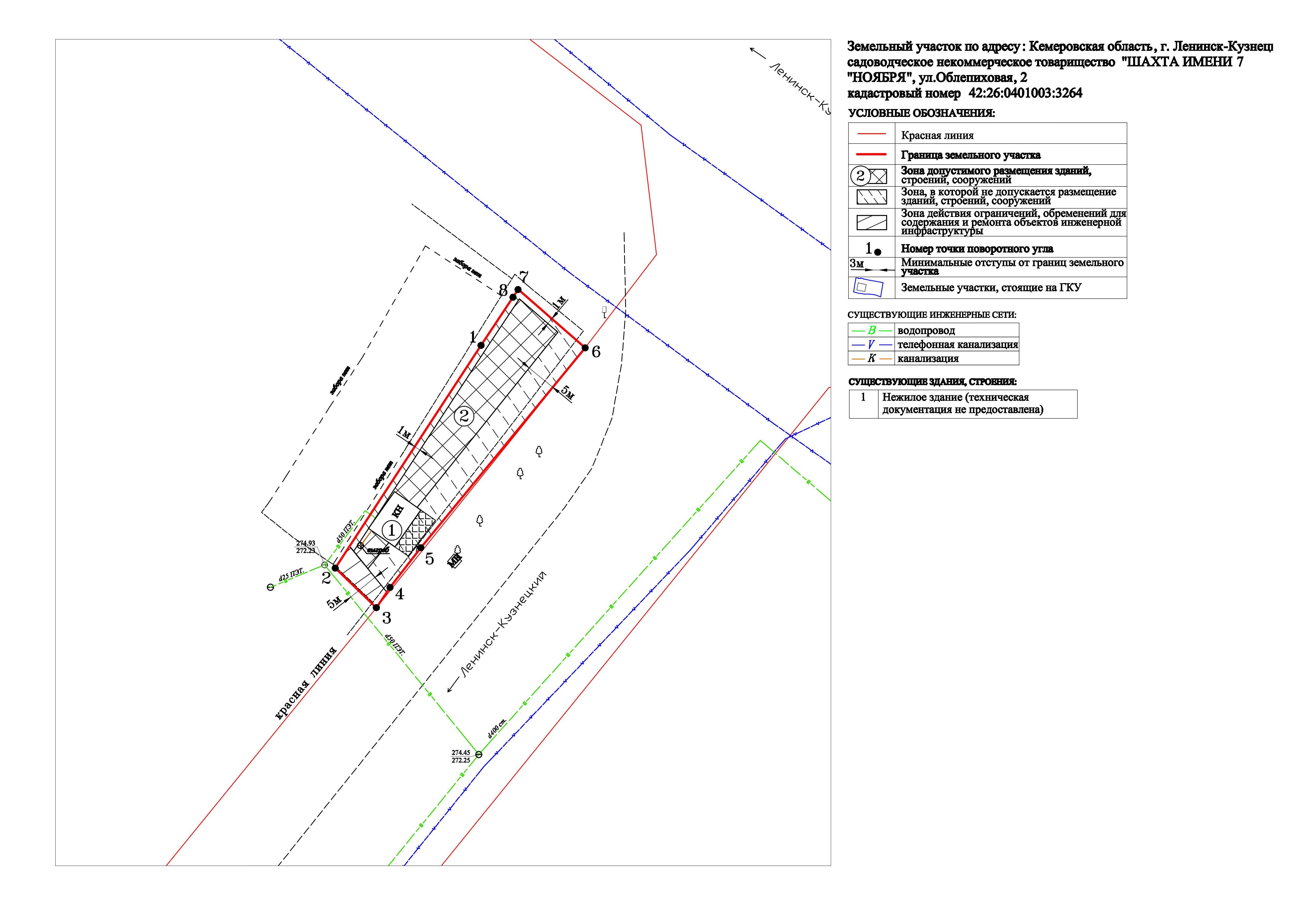 Администрация Ленинск-Кузнецкого городского округа и Манукян А.В. по вопросу предоставления разрешения на отклонение от предельных параметров разрешенного строительства, реконструкции объекта капитального строительства на земельном участке с кадастровым номером 42:26:0401003:3264, расположенном по адресу: Кемеровская область, г.Ленинск-Кузнецкий, садоводческое огородническое некоммерческое товарищество «ШАХТА ИМЕНИ 7 НОЯБРЯ», ул.Облепиховая, 2, в части изменения места допустимого размещения строений, зданий, сооружений – уменьшение минимальных отступов от границ земельного участка с 5 м до 1 м по юго-восточной стороне от точки 3 до точки 6 на градостроительном плане земельного участка.