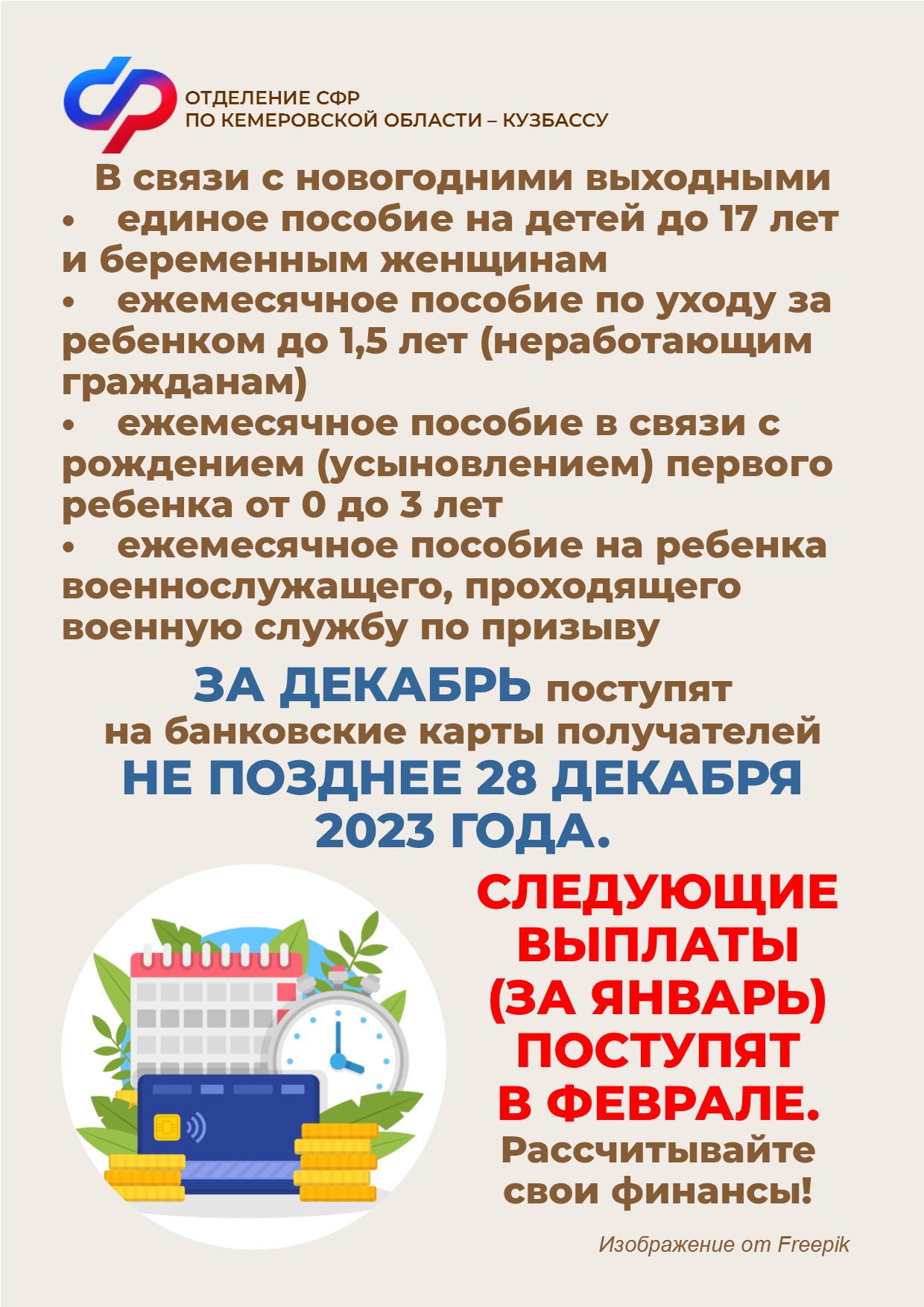 будут выплачены досрочно (то есть в декабре – за декабрь), не позднее 28 декабря 2023 года. Таким образом, в январе за декабрь пособия выплачиваться уже не будут. Следующие выплаты пройдут 2 февраля за январь.