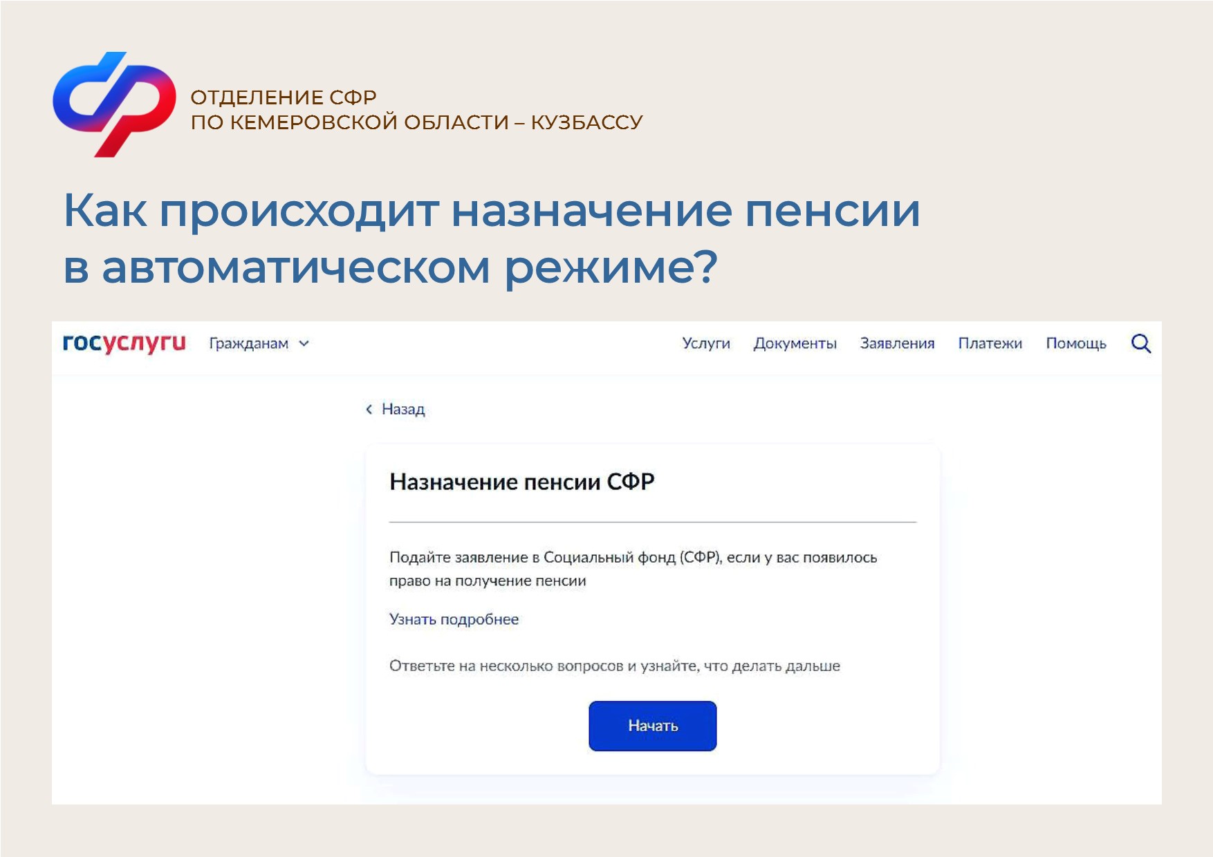 Заявление на установление пенсии подается на портале госуслуг. При его оформлении гражданину может быть предложено также подать заявление на назначение пенсии в автоматическом режиме.