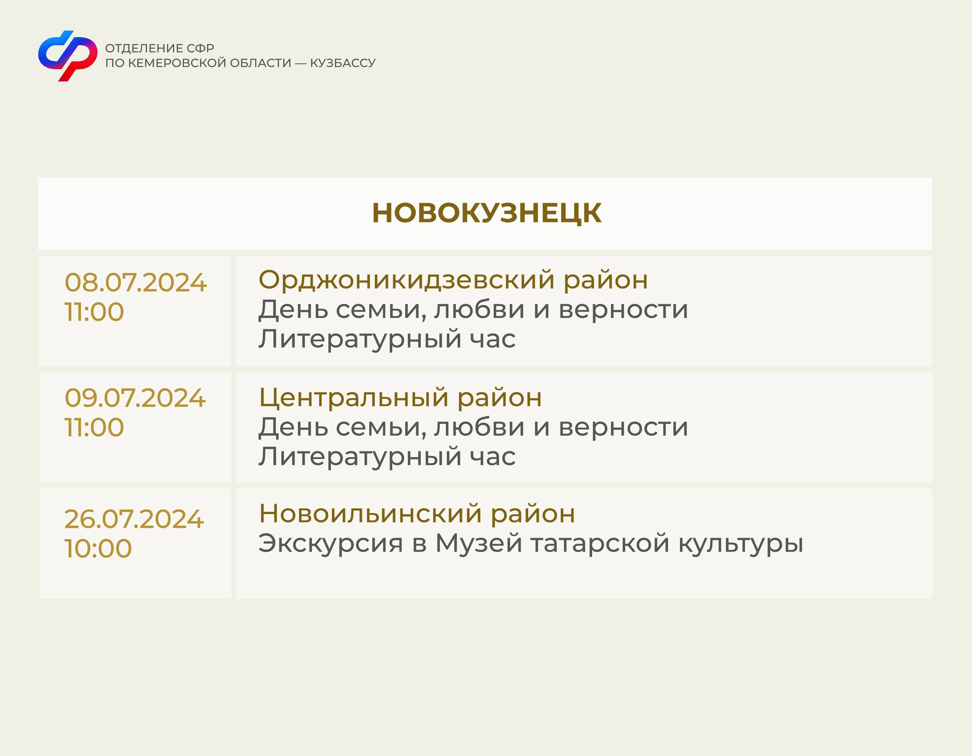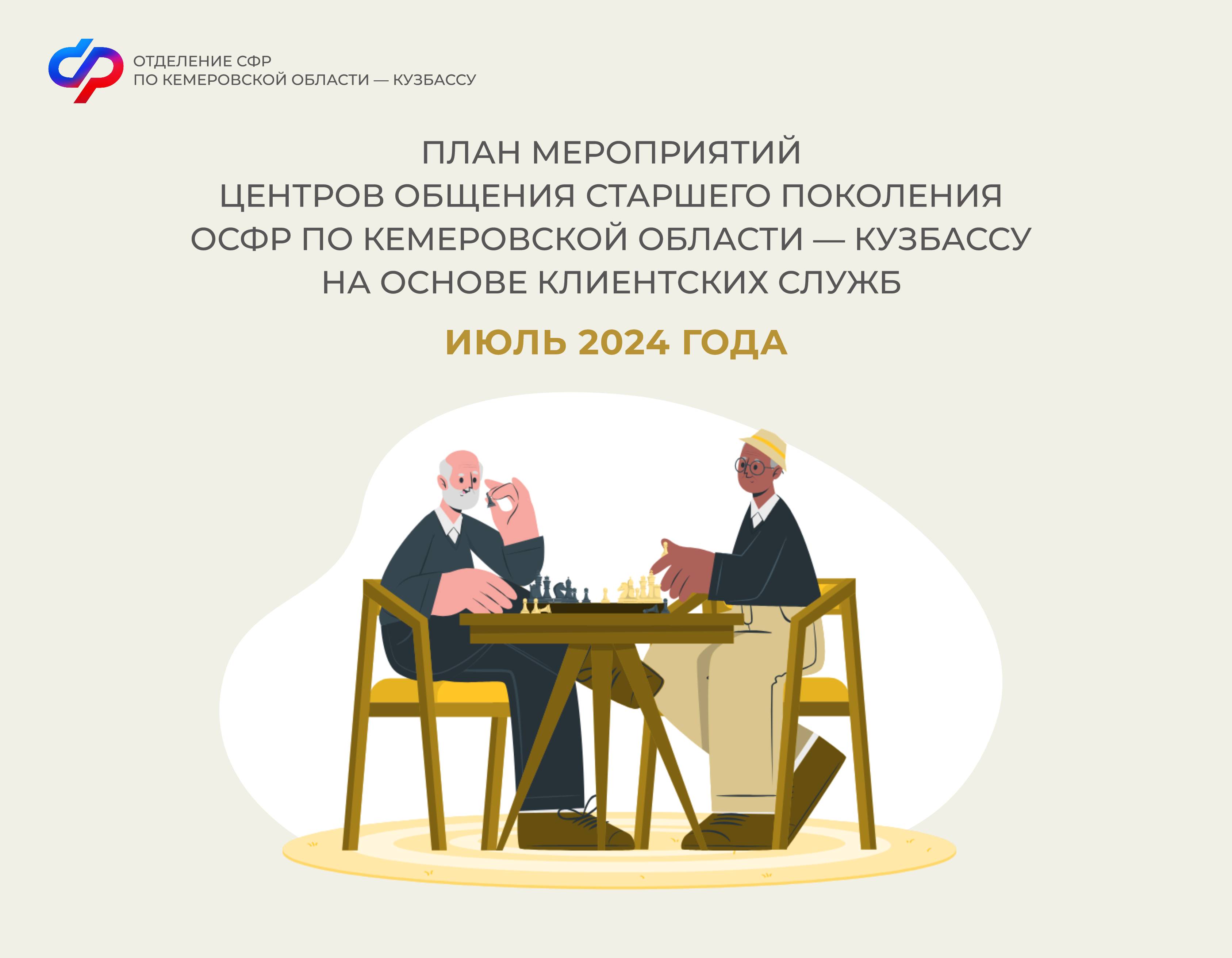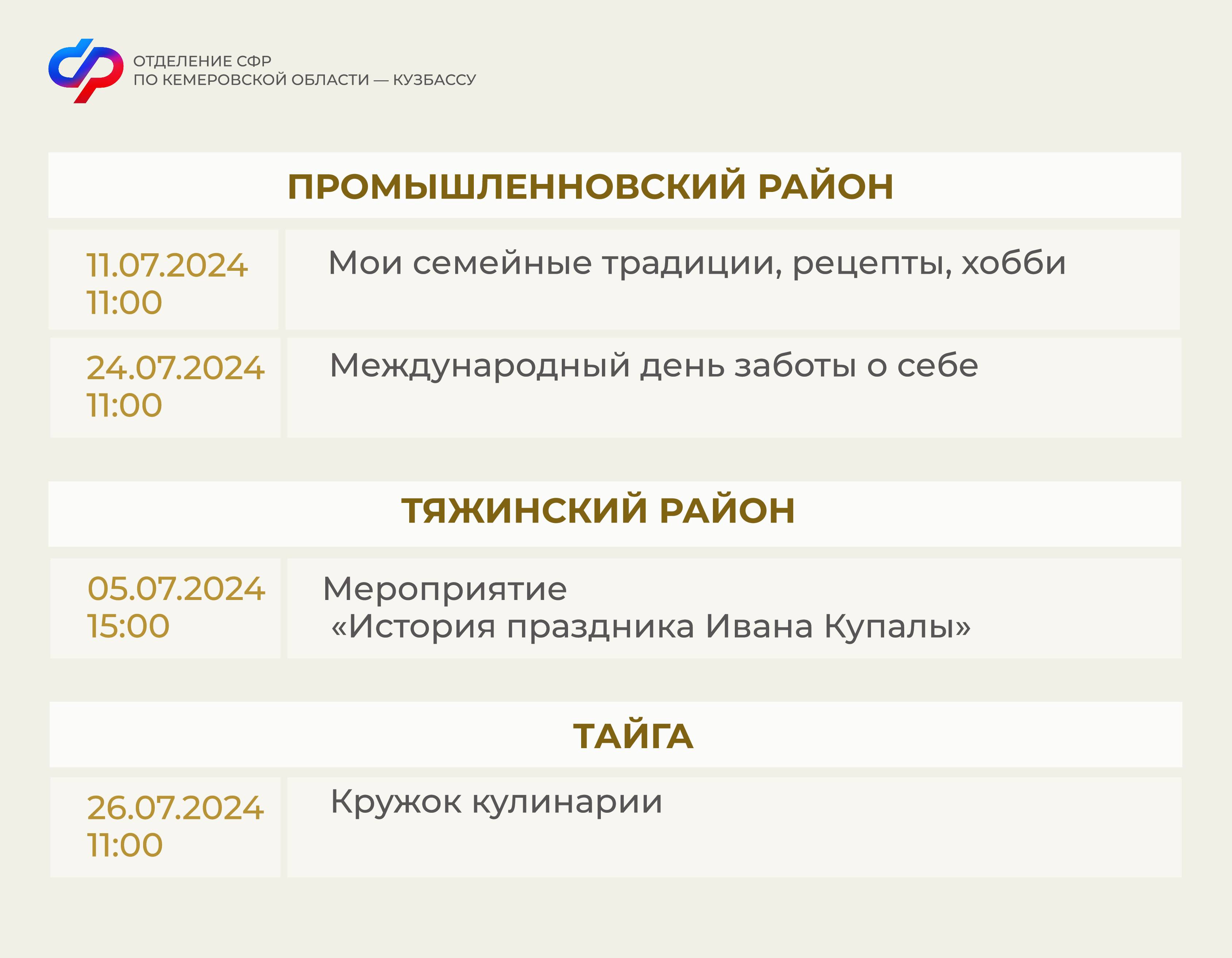 В июле в Центрах общения старшего поколения ОСФР по Кемеровской области — Кузбассу в Центральном, Орджоникидзевском и Новоильинском районах Новокузнецка, в Мариинске, Белове, Тисуле, Тайге, Промышленной и Тяжинском пройдут различные события. Подробнее о них – в наших карточках.