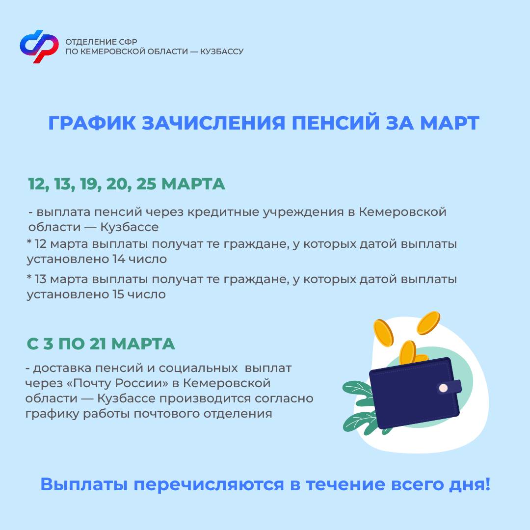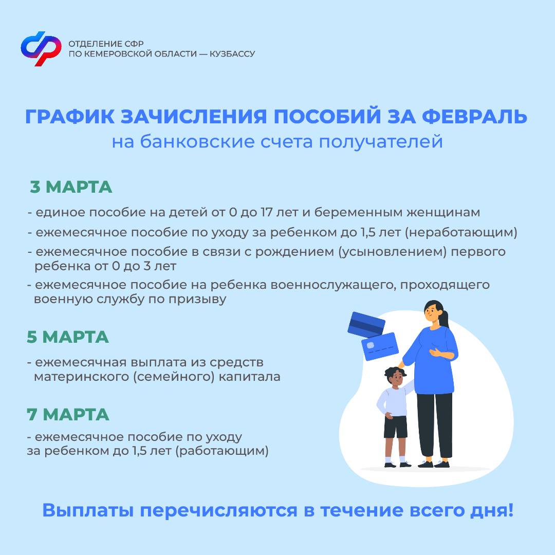Просим учесть, что детские пособия выплачиваются за предыдущий месяц, то есть в марте вам поступит пособие за февраль. Пенсии выплачиваются за текущий месяц.