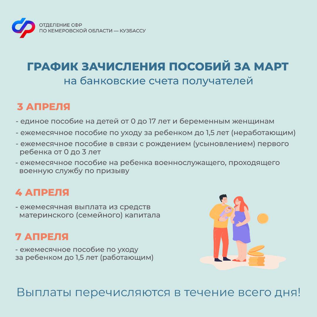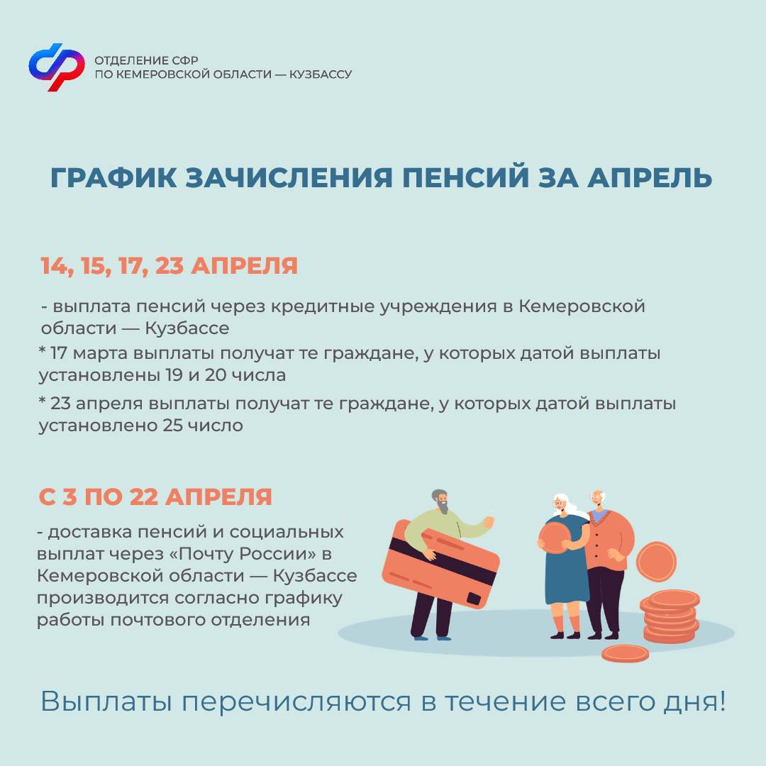 Публикуем график выплат для получателей детских пособий и пенсий в Кемеровской области – Кузбассе на апрель.