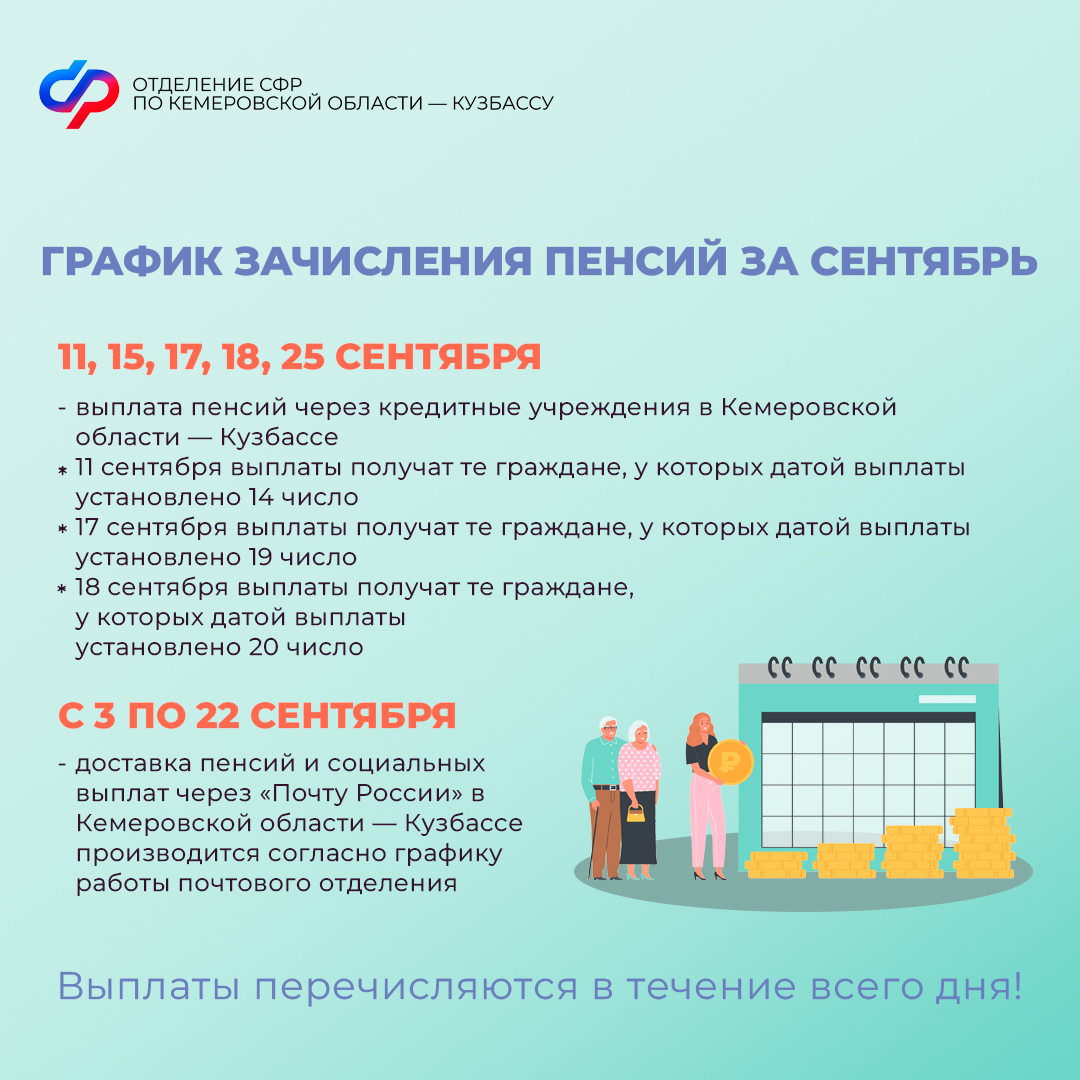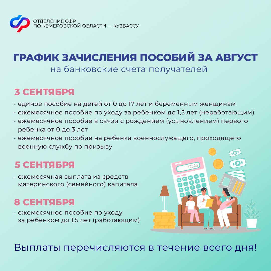 Отделение СФР по Кемеровской области напоминает: выплата пенсий и социальных выплат осуществляется за текущий месяц. Пособия перечисляются в новом месяце за предыдущий, то есть в сентябре вы получите пособия за август.