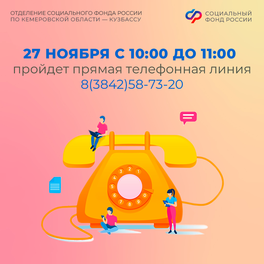 27 ноября, в четверг, с 10 до 11 часов в Отделении Социального фонда России по Кемеровской области - Кузбассу пройдет телефонная прямая линия.