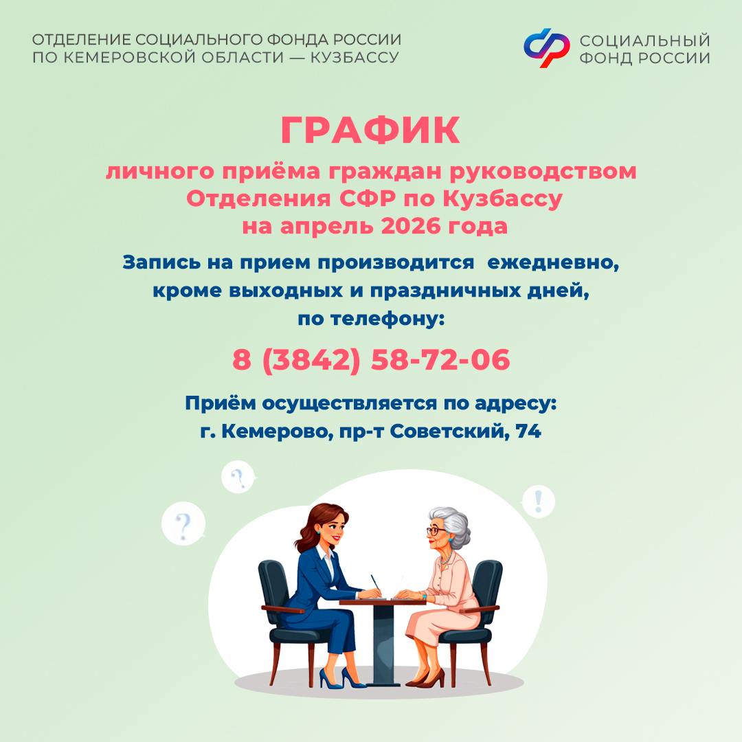 График личного приема граждан руководством Отделения СФР по Кемеровской области в апреле 2026 года – в наших карточках, а также на странице регионального Отделения СФР https://sfr.gov.ru/branches/kuzbass/